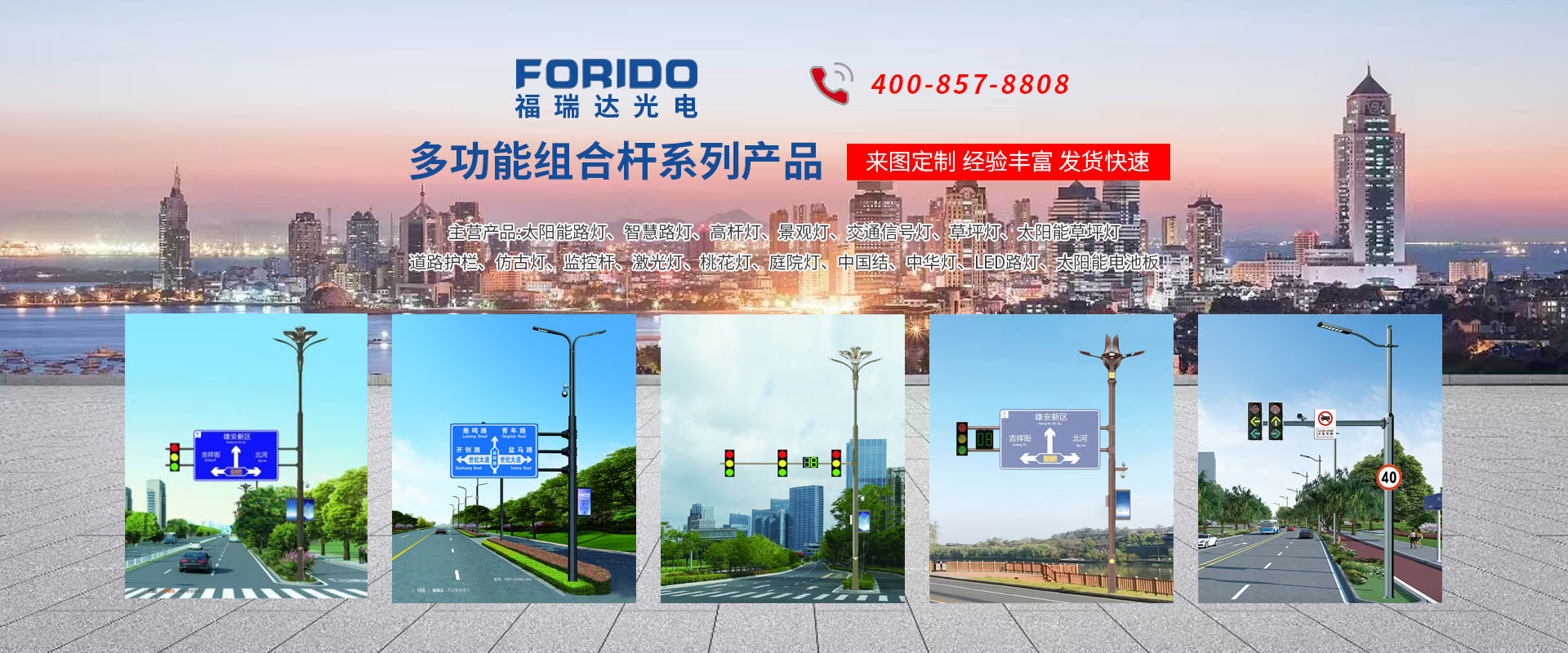 揚(yáng)州福瑞達(dá)光電科技有限公司位于淮左名都?xì)v史文化名城、中國路燈制造基地?fù)P州市北郊菱塘工業(yè)園,公司占地面積76000平方米,注冊資金10518萬元,擁有高級技術(shù)嫻熟的員工280多人,擁有大型折彎機(jī)、激光切割、數(shù)控注塑機(jī)、壓鑄機(jī)、自動埋弧焊、氣焊、彩色粉末靜電噴塑等大型自動化設(shè)備,我公司是一家集設(shè)計(jì)、研發(fā)、生產(chǎn)、銷售、施工安裝服務(wù)為一體的戶外交通照明產(chǎn)品制造商,主要生產(chǎn)智慧路燈、太陽能路燈、LED路燈、高桿燈、景觀燈、交通信號燈、交通標(biāo)志牌、通信鐵塔、路跨鋼結(jié)構(gòu)、公交站臺、太陽能光伏組件、景點(diǎn)亮化、樓宇亮化工程的設(shè)計(jì)施工等。公司秉承開拓創(chuàng)新、銳意進(jìn)取、精誠服務(wù)的企業(yè)精神,堅(jiān)持以“誠信為本、技術(shù)為先、服務(wù)是金”的合作理念,我們憑借先進(jìn)的制造工藝、優(yōu)質(zhì)的產(chǎn)品質(zhì)量、合理的市場價格和完善的售后服務(wù)贏得了廣闊的市場和客戶的信賴?! ∥夜疽淹ㄟ^ISO9001質(zhì)量體系認(rèn)證、ISO14001環(huán)境管理體認(rèn)證,CQC產(chǎn)品認(rèn)證,中國節(jié)能產(chǎn)品認(rèn)證,通過“CCC”強(qiáng)制性產(chǎn)品認(rèn)證,具有市政總承包,照明,交安,設(shè)計(jì)等資質(zhì)···